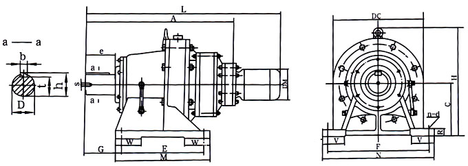 注:1、表中所列尺寸單位為毫米,重量單位為千克,功率單位為千瓦。 2、所用電動機(jī)為Y系列及YA增安型,配YB,YEJ,YCT電動機(jī)與公司方聯(lián)系。 3、D軸徑配合為h6。 4、B系列安裝尺寸參照單級尺寸。 |