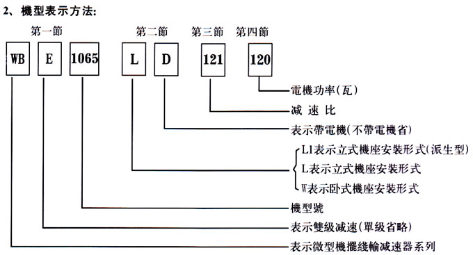 WBE1065-LD-121-120表示微型擺線減速器,機(jī)型號(hào)1065型,雙級(jí)減速,立式機(jī)座安裝形式,帶三相四相交流電動(dòng)機(jī),減速比1:121,電機(jī)功率120瓦。