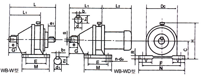 a、單級(jí)減速比機(jī)型有WB65型、WB100型、WB120型、WB150型、其減速比分別有9、11、17、23、29、35、43、59、71、87。