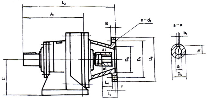 | 機(jī)型號(hào) | 電動(dòng)機(jī)功率 (KW) | 電動(dòng)機(jī) 機(jī)座號(hào) | Ds | d1 | 公差 | b1 | h1 | L4 | D6 | 公差 | D7 | D8 | f | B | n | d2 | L3 | C | A1 | L2 |